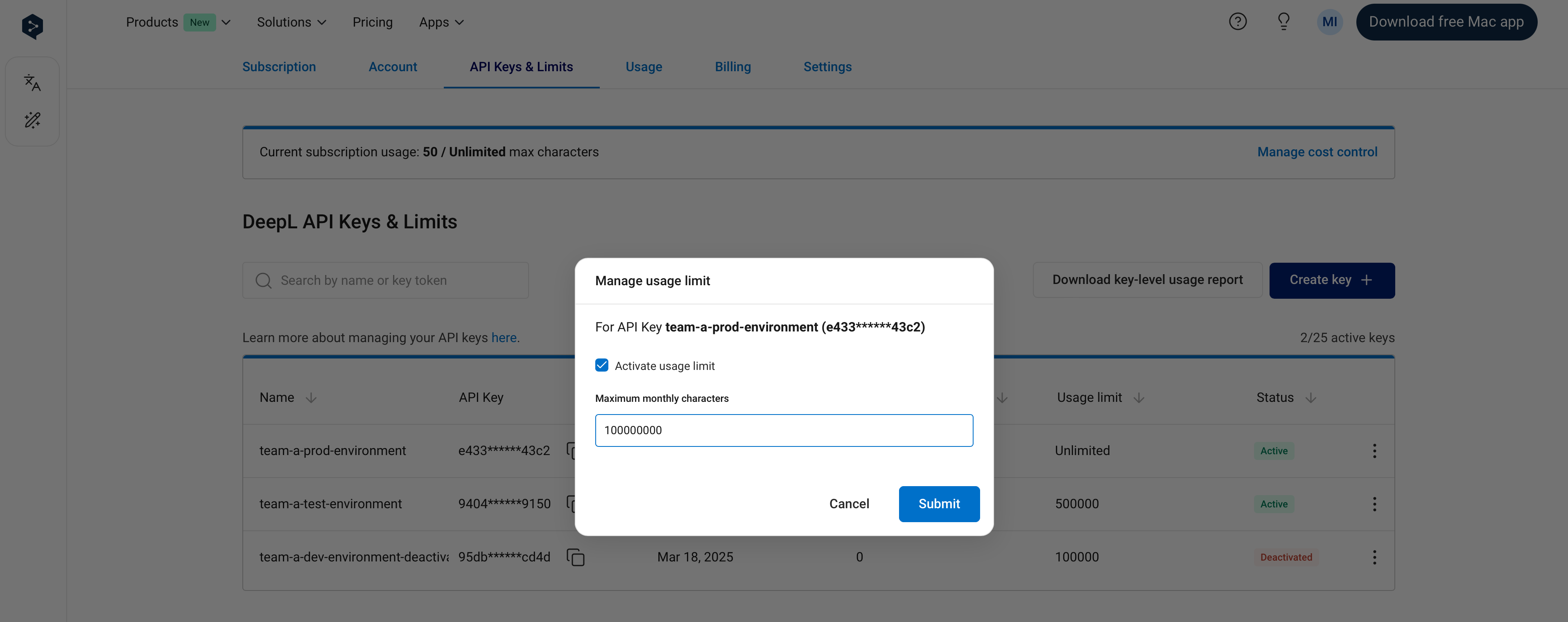 It’s possible to set an API key-level usage limit. Key-level limits restrict the number of total characters (across text translation, document translation, and text improvement) that can be consumed by an API key in a one-month usage period. You can see the dates of your current usage period in the Usage tab. For example, if you set a key-level usage limit of 1,000,000 characters, the API key will not consume more than 1,000,000 characters per usage period. In the “API Keys & Limits” tab, the “Characters consumed” column in the API keys table shows the number of characters consumed by an API key in the current usage period. The character count will “reset” at the start of the next usage period, at which point the key will again be able to consume characters. As with subscription-level cost control:- You’ll receive notification emails when 80% and 100% of a key-level limit has been reached